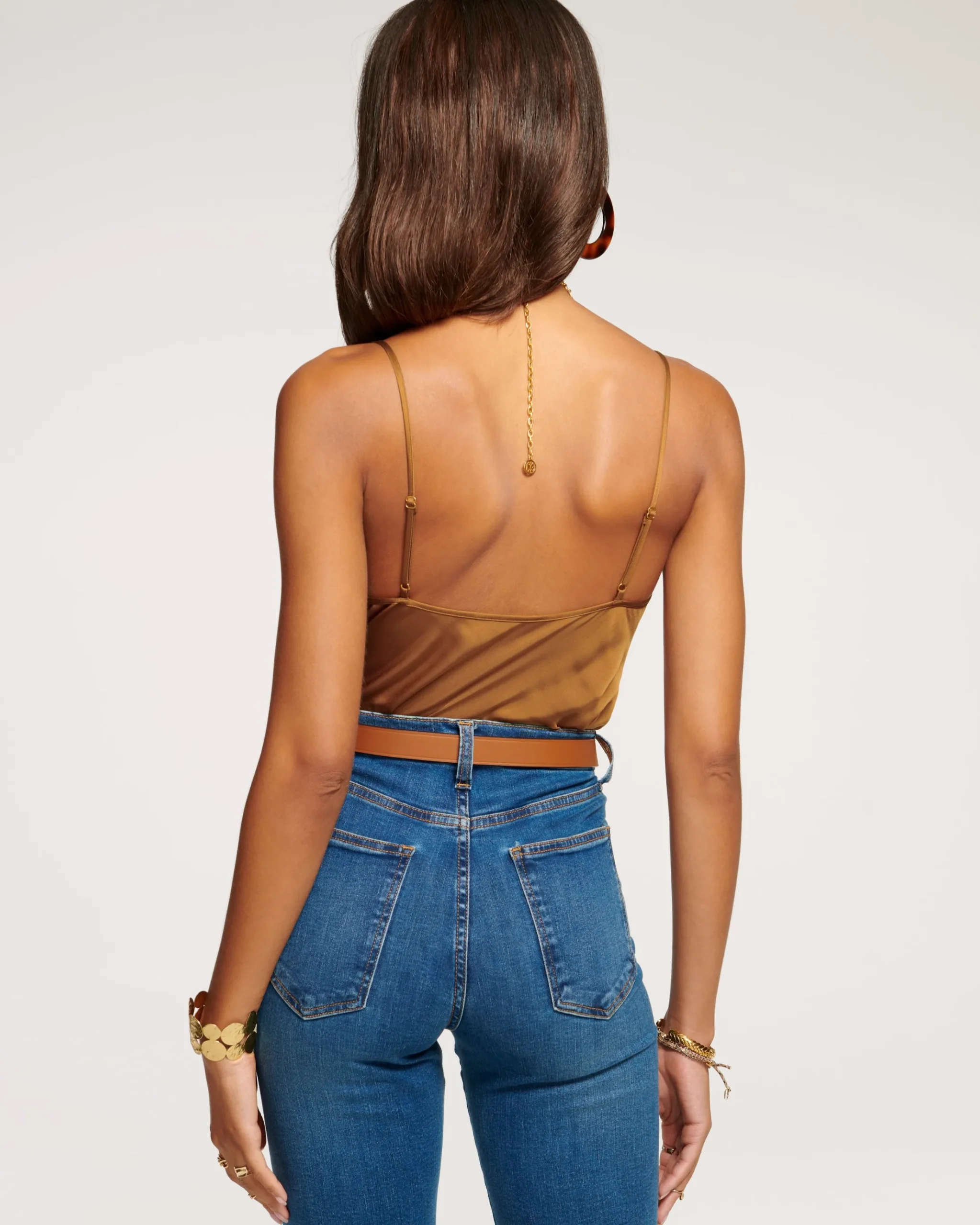 Give your wardrobe a seasonal upgrade with the Abigail, a covetable copper camisole that can be styled in countless ways. Let your femininity shine through with this fitted satin silhouette, fashioned with thin adjustable straps and a cowl neck, and achieve a refined look whether worn alone or beneath a jacket.