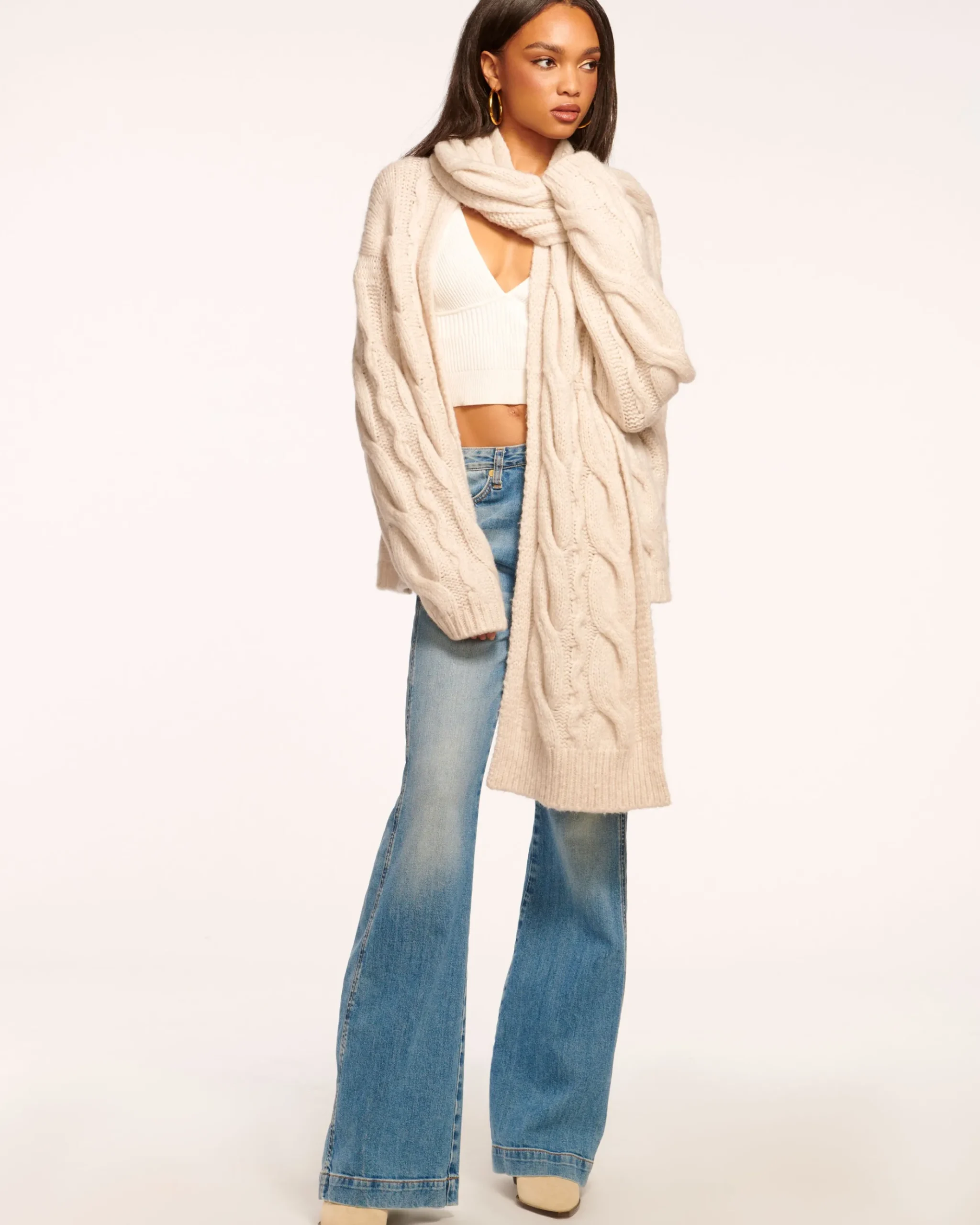 Wrap yourself up in the Agnes, a cable knit sweater with a matching removable scarf. This wool-blend cardigan is a must-have wardrobe essential for casual fall days. Layer over a pair of jeans and a casual top for a cute and comfy outfit.