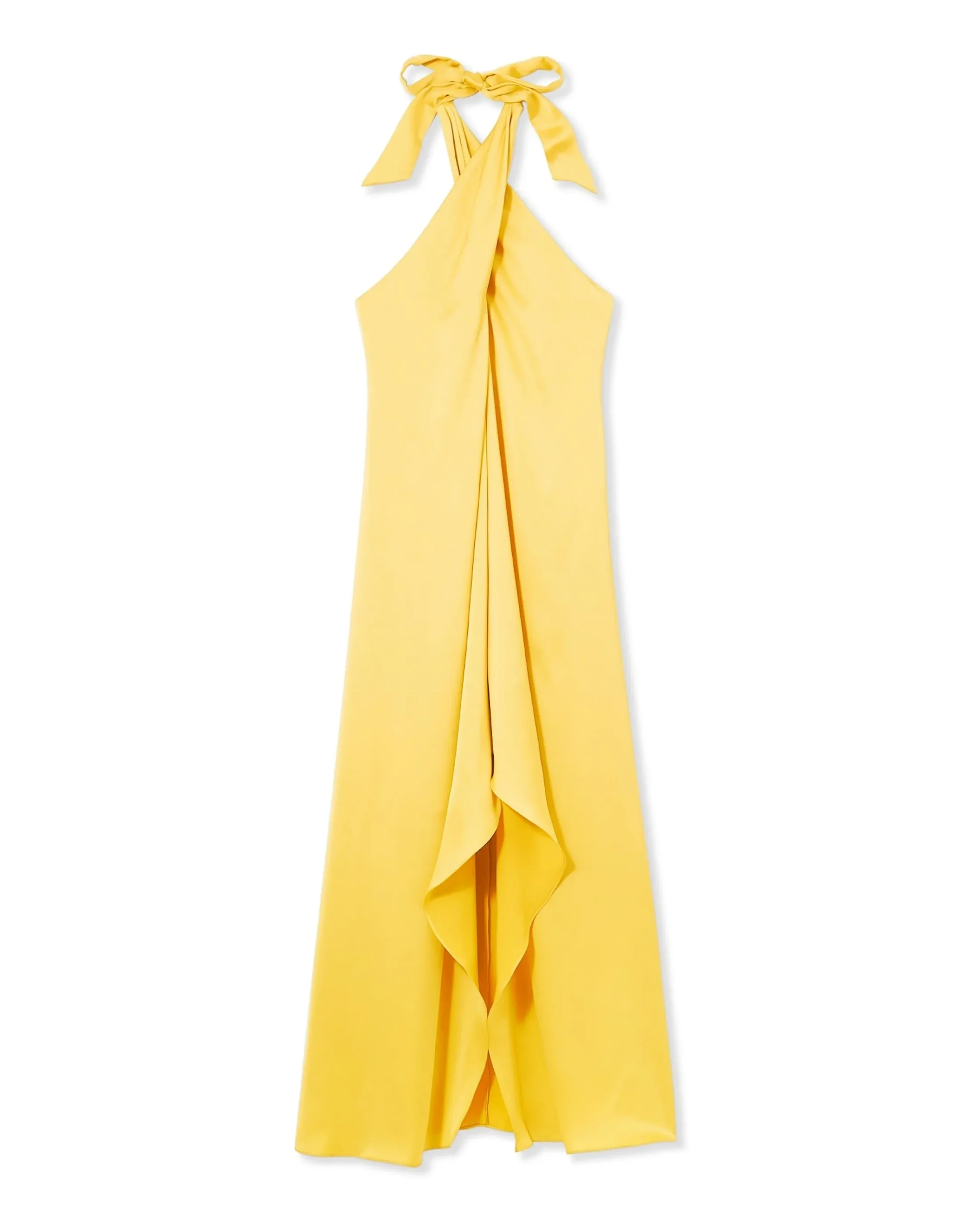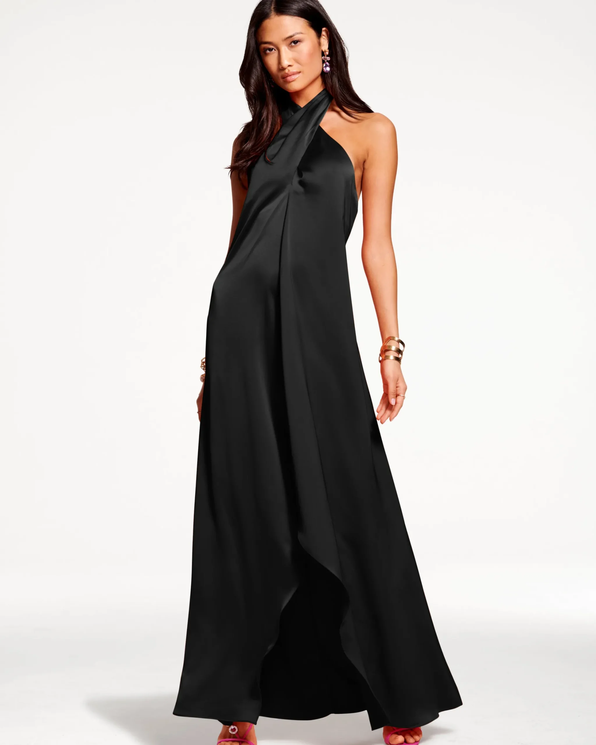 With an effortless ruffle and plenty of movement, the Carey is perfect for dancing the night away at your next elegant black tie event. The crossover silhouette features a halter neckline, daring plunging back, and a hint of leg.