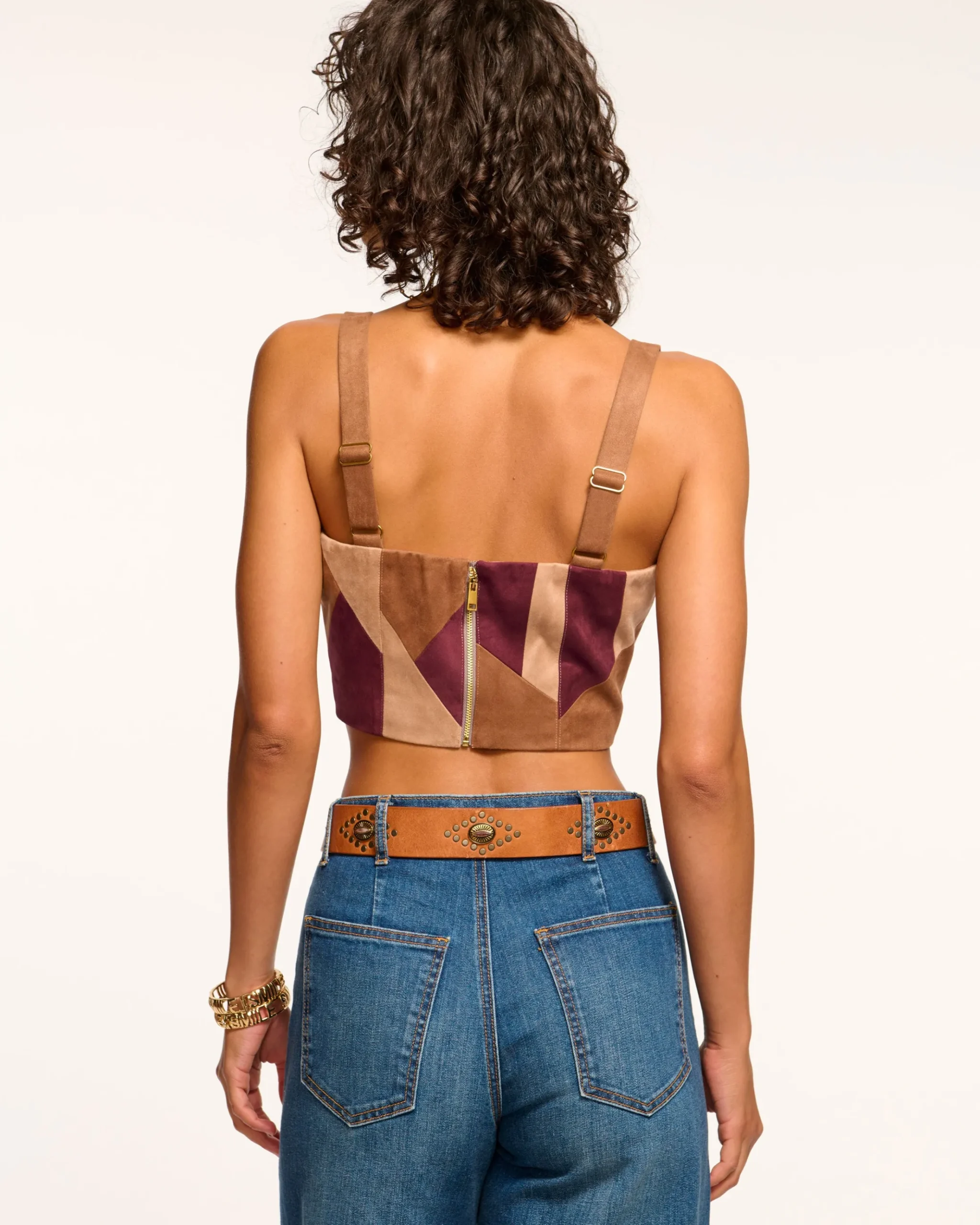 Show some skin in the Finnley, a patchwork faux suede crop top designed to match the Jeannie Patchwork Faux Suede Skirt for a high-impact, Western glam look.