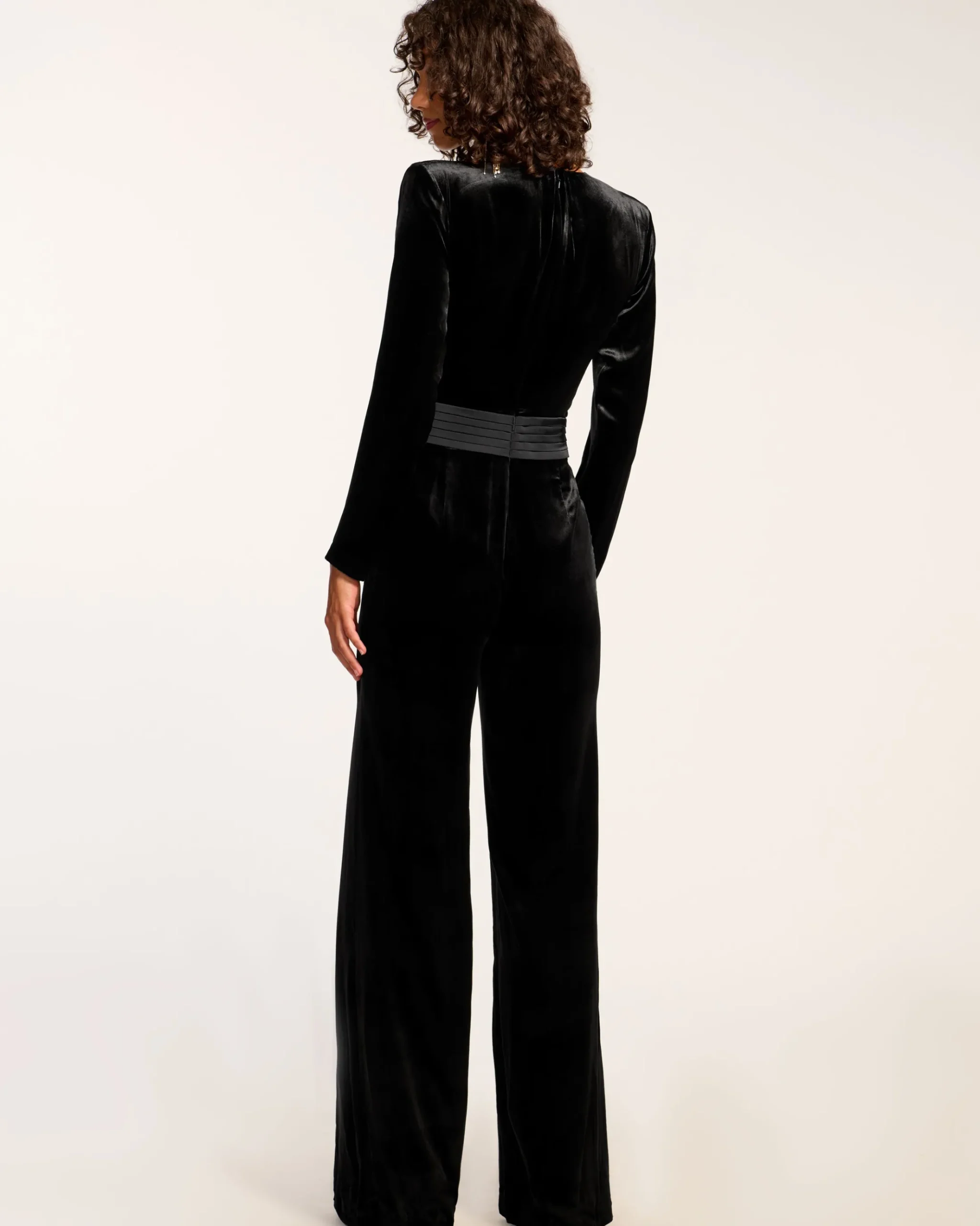 Elevate your night out style with the Gabriel, a long sleeve jumpsuit in a soft velvet. Featuring a plunging V-neck, structured shoulders, and a form-fitting bodice, it’s designed to flatter your figure. The elongating wide legs pair perfectly with boots or heels, while a contrast waistband adds flair. Complete the look with gold jewelry.