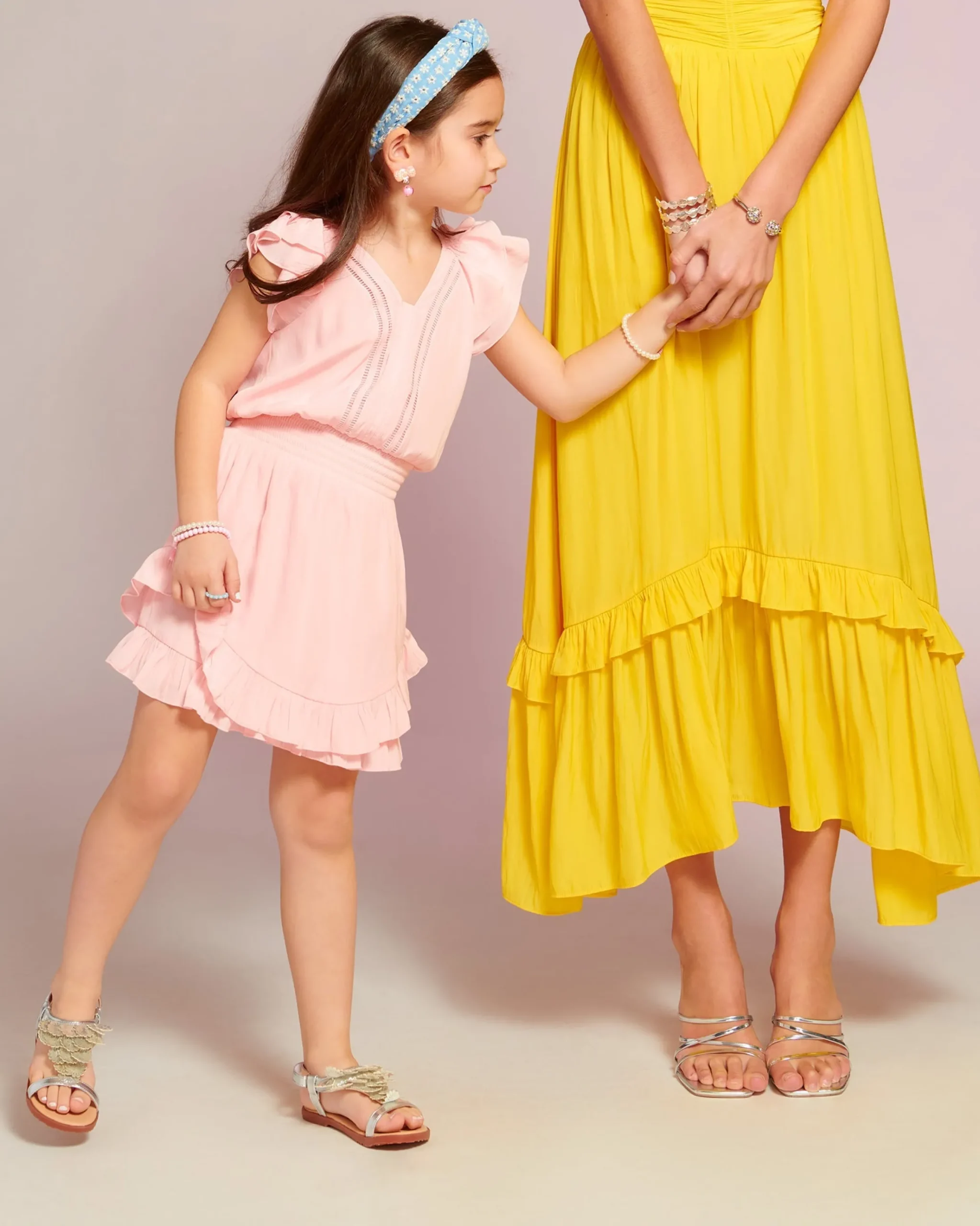 Wear the Lola Ruffle Mini Dress & Joanie Short Sleeve Maxi Dress to match with your mini.