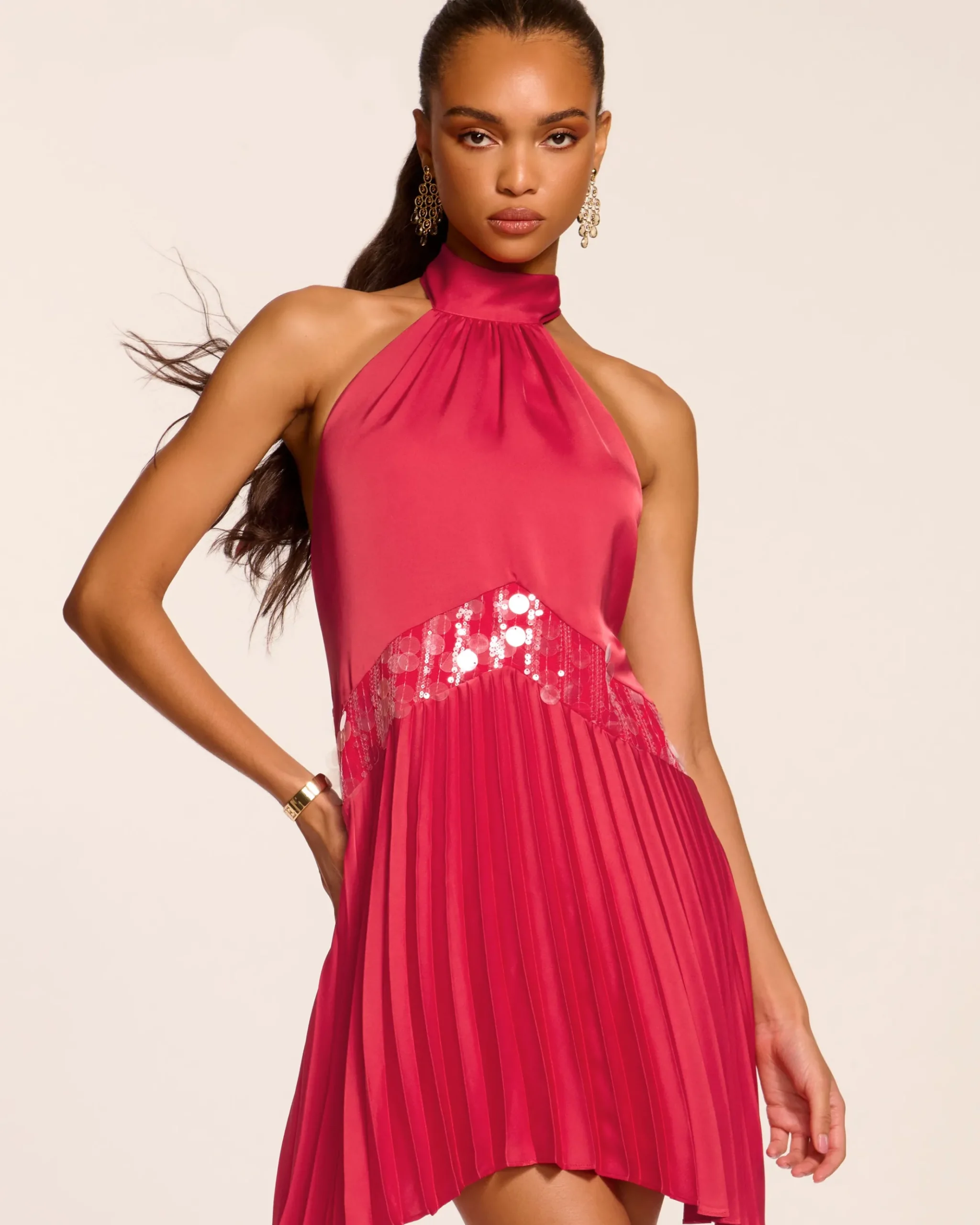 Paillettes with a purpose. This halter neck wonder turns every movement into a light show, while the pleated skirt ensures you’re leading the dance. A relaxed fit proves comfort and glamour aren’t mutually exclusive. Let the spotlight chase you.