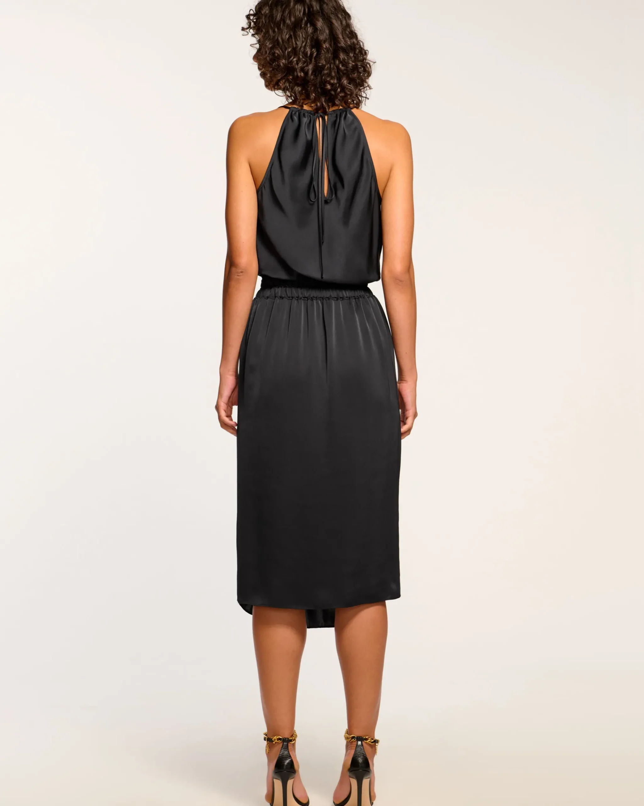 Elegance meets ease in the Monika. The cowl neck and self-tie detail create intrigue while an elastic back waist ensures comfort. A relaxed blouson bodice delivers effortless sophistication. Your new go-to for effortless glamour and midnight dancing.