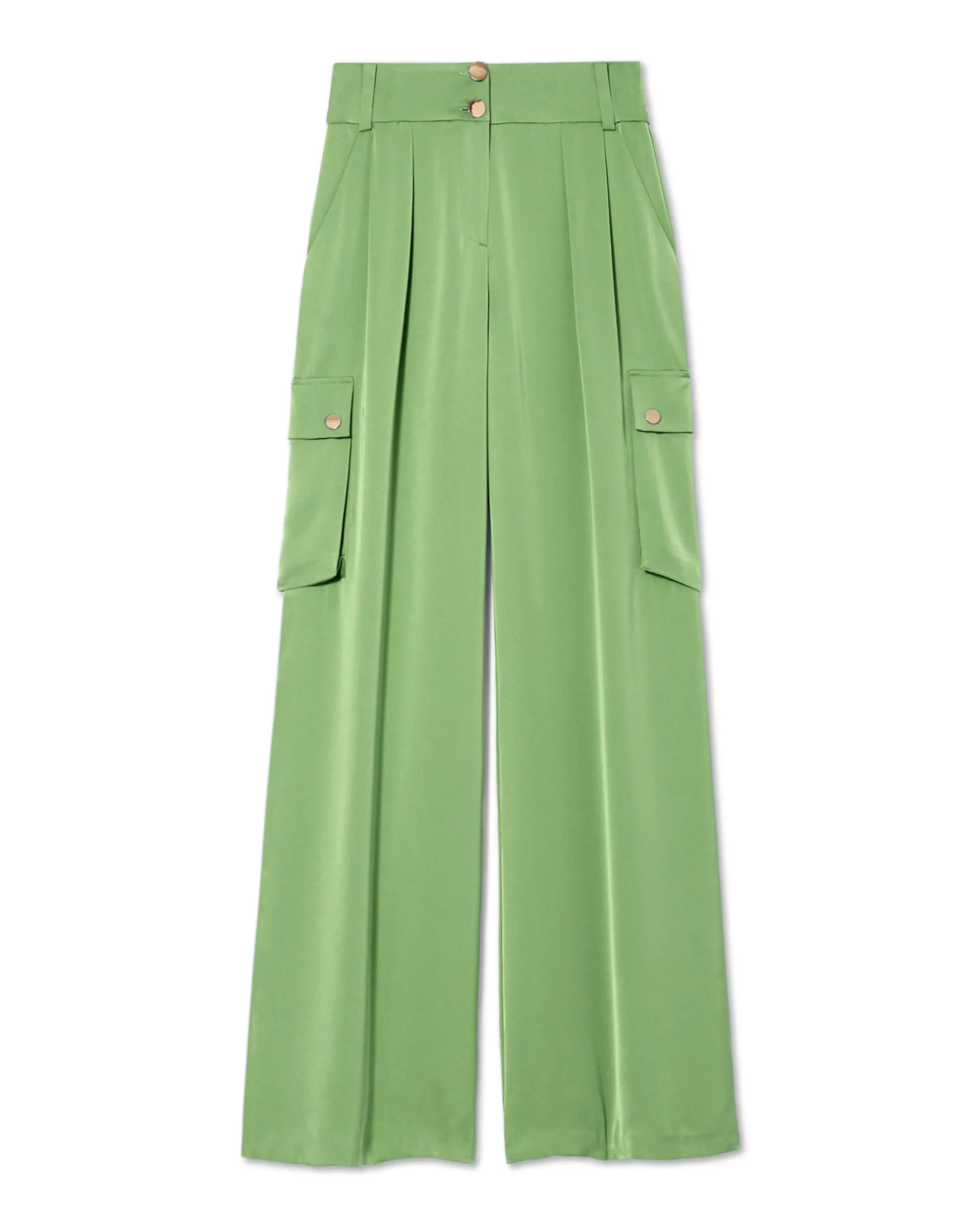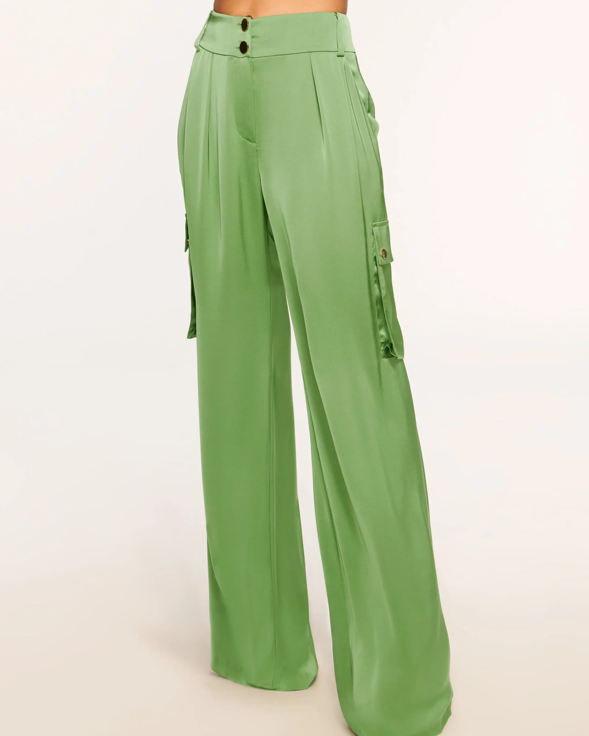 For a work event or ladies night out, the Rumer is beautifully crafted with silky satin charmeuse for a polished fit. These high waist trousers have metallic snaps across the waistline and side pockets, delivering a utilitarian touch suitable for any occasion.