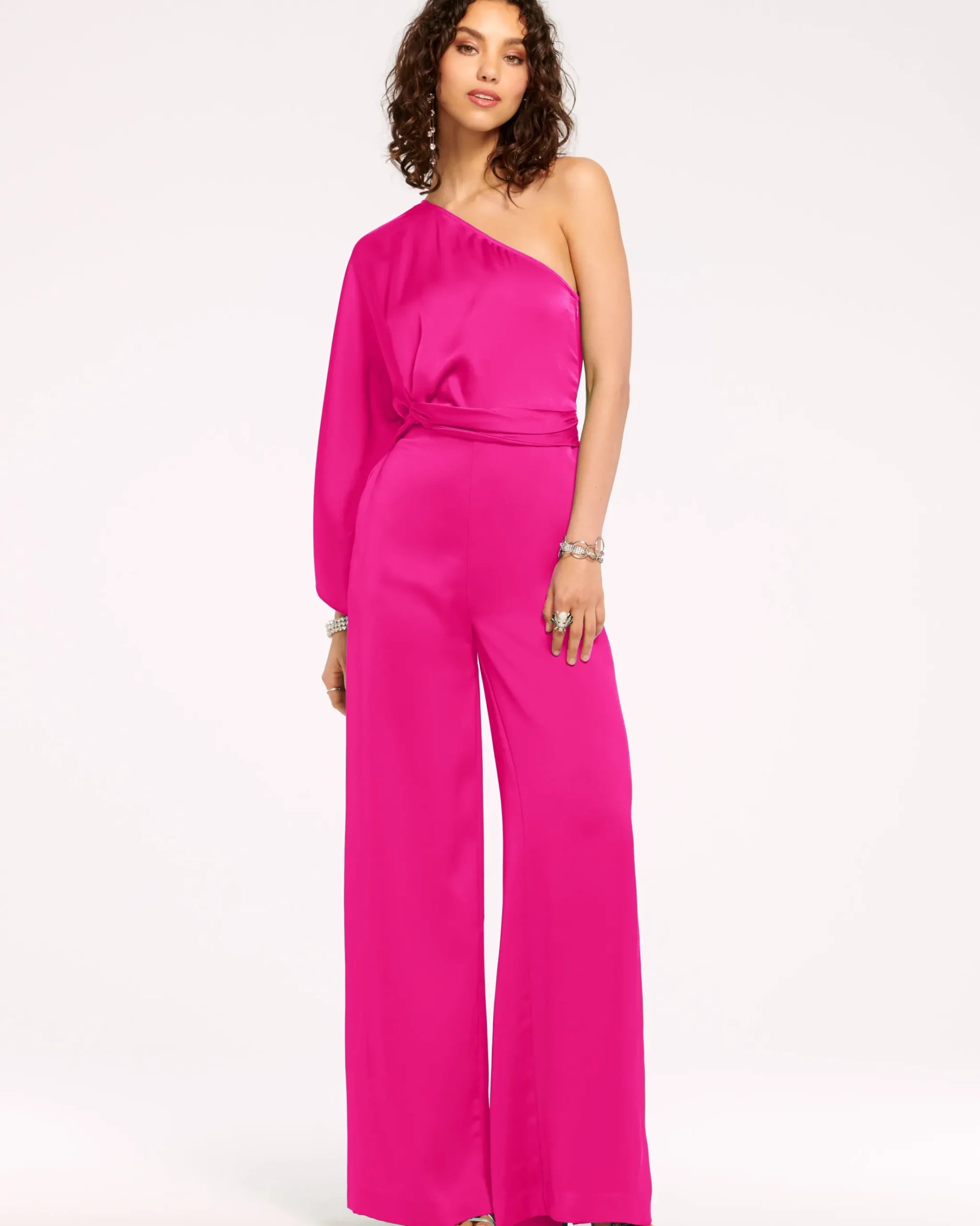 Feel bold and look beautiful in the Simone, a statement jumpsuit fashioned in rich jewel tones. Get the best of both worlds with the one shoulder bodice, expertly fashioned with one dramatic sleeve. Cinched at the waist with an alluring twist, this sweeping design will have you standing tall.