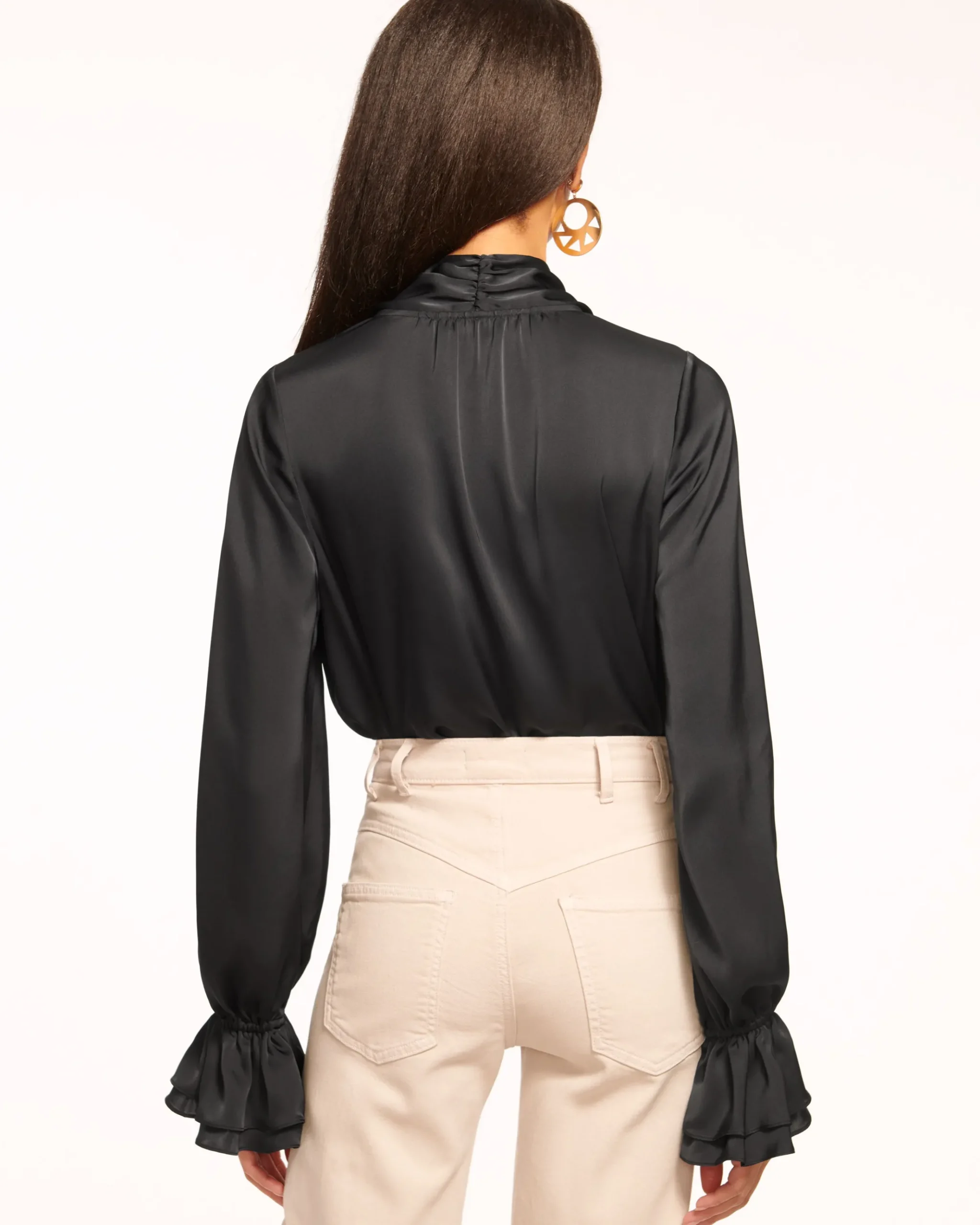 Elegant and versatile, the Tammy tie front blouse is the perfect addition to your wear-to-work wardrobe. The tie at the v-neckline and double ruffle-adorned cuffs add a feminine touch. Style with high-waisted denim for a polished fall look.