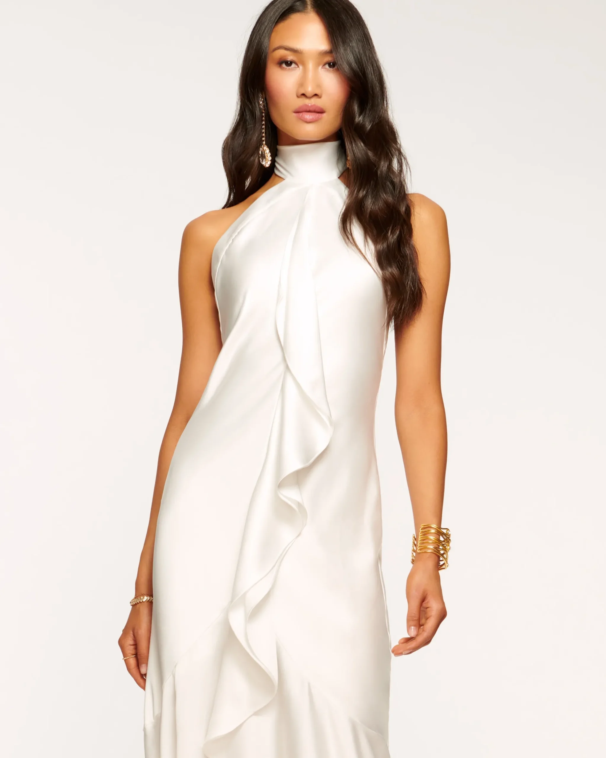 Look like a movie star when you slip into the black tie approved Tera. This polished stretch satin dress has a dramatic high neck that enhances the open shoulder bodice, while the dramatic ruffle adds movement down the asymmetrical silhouette.