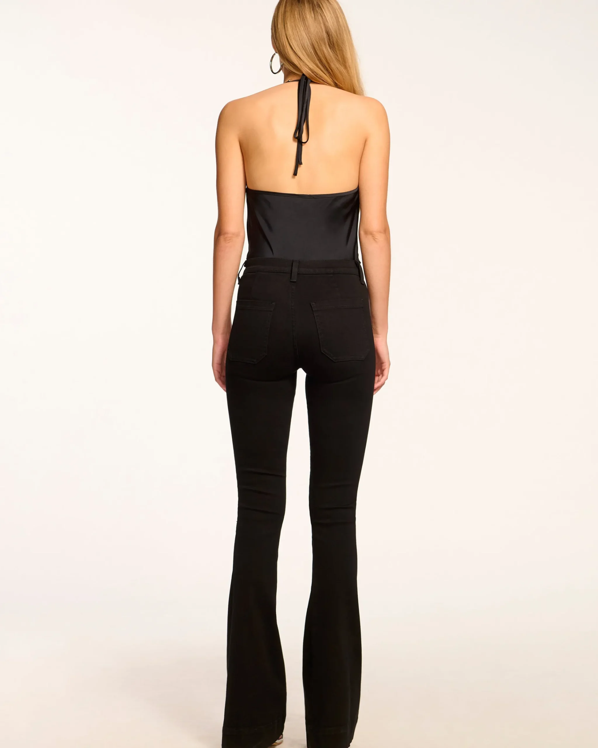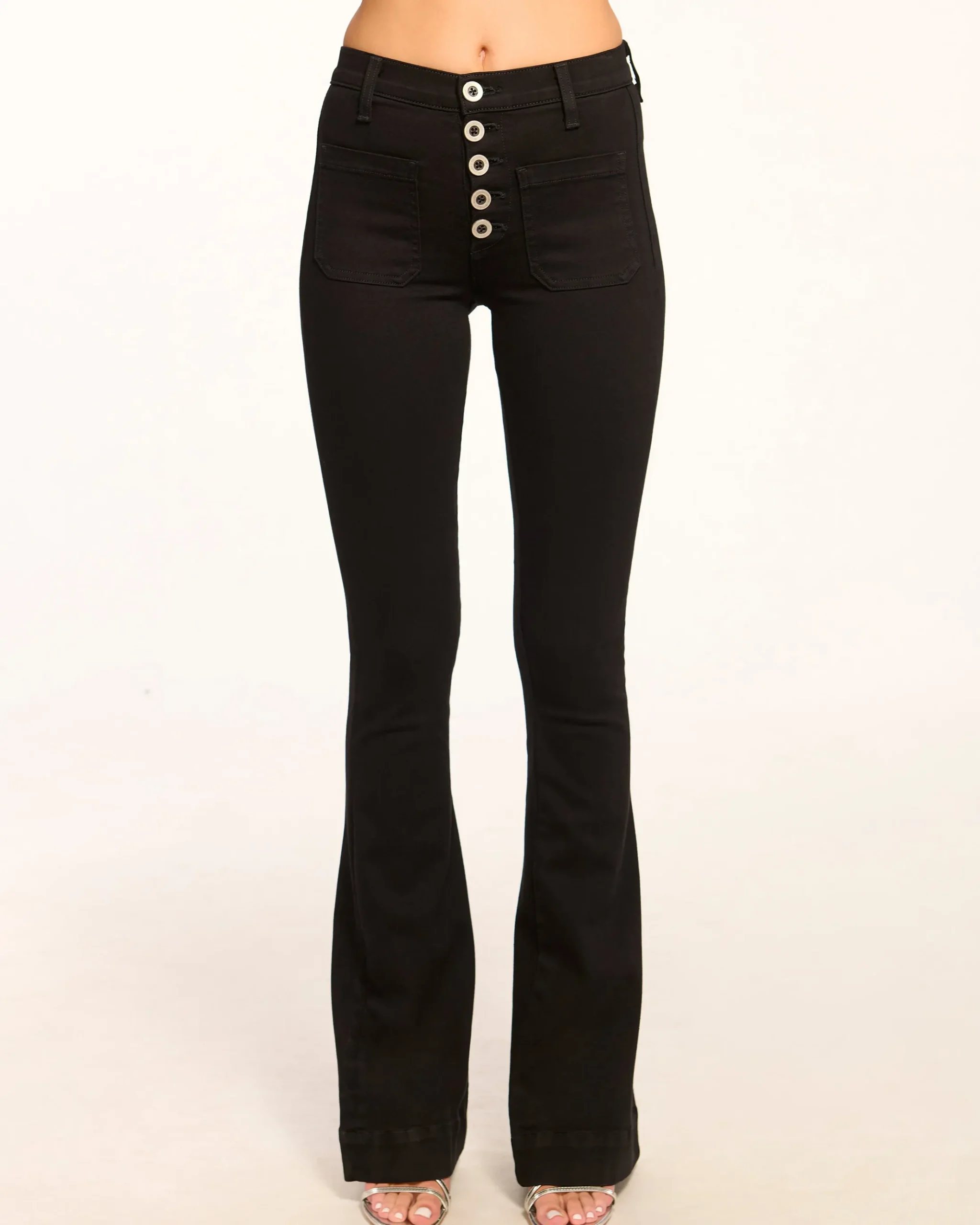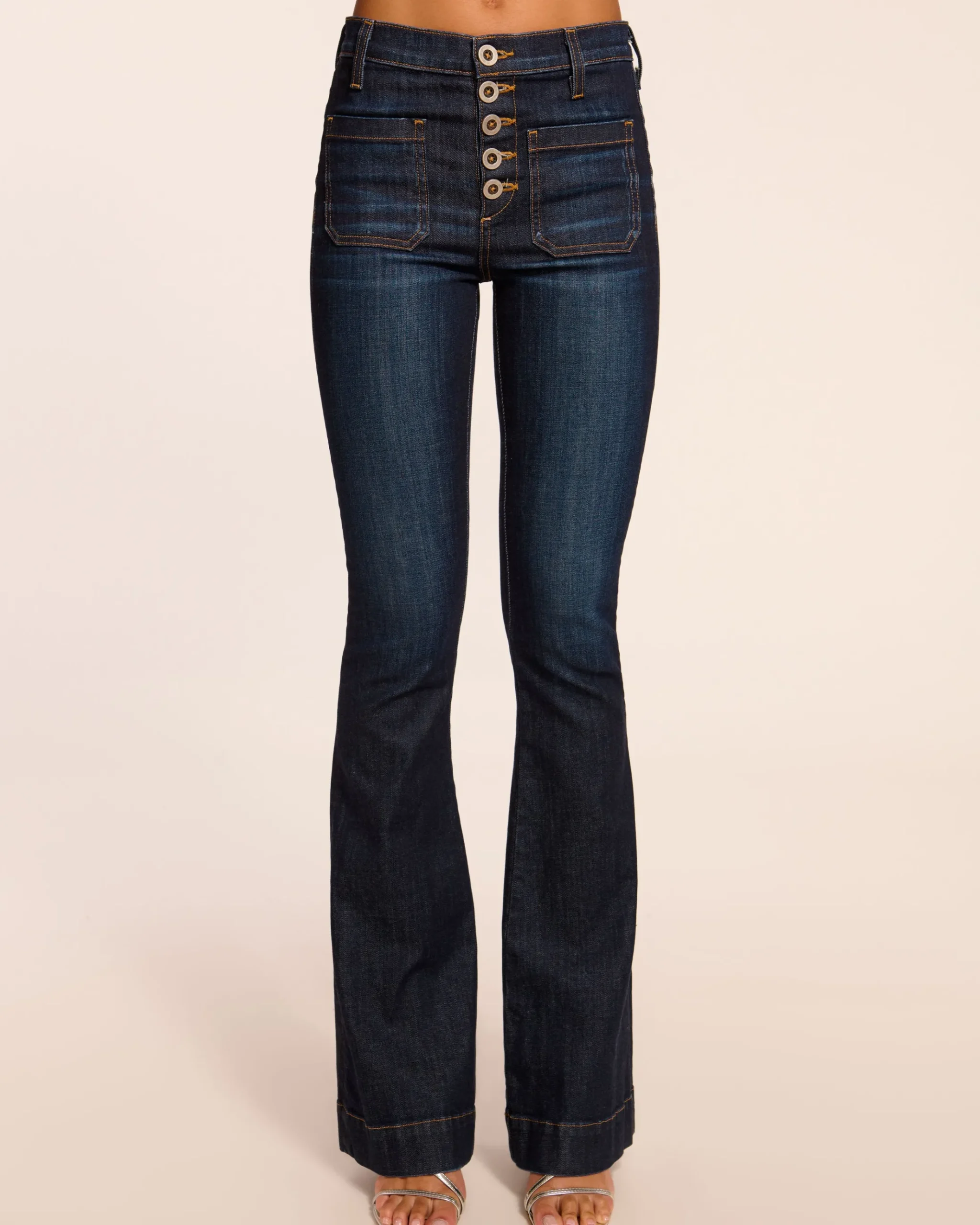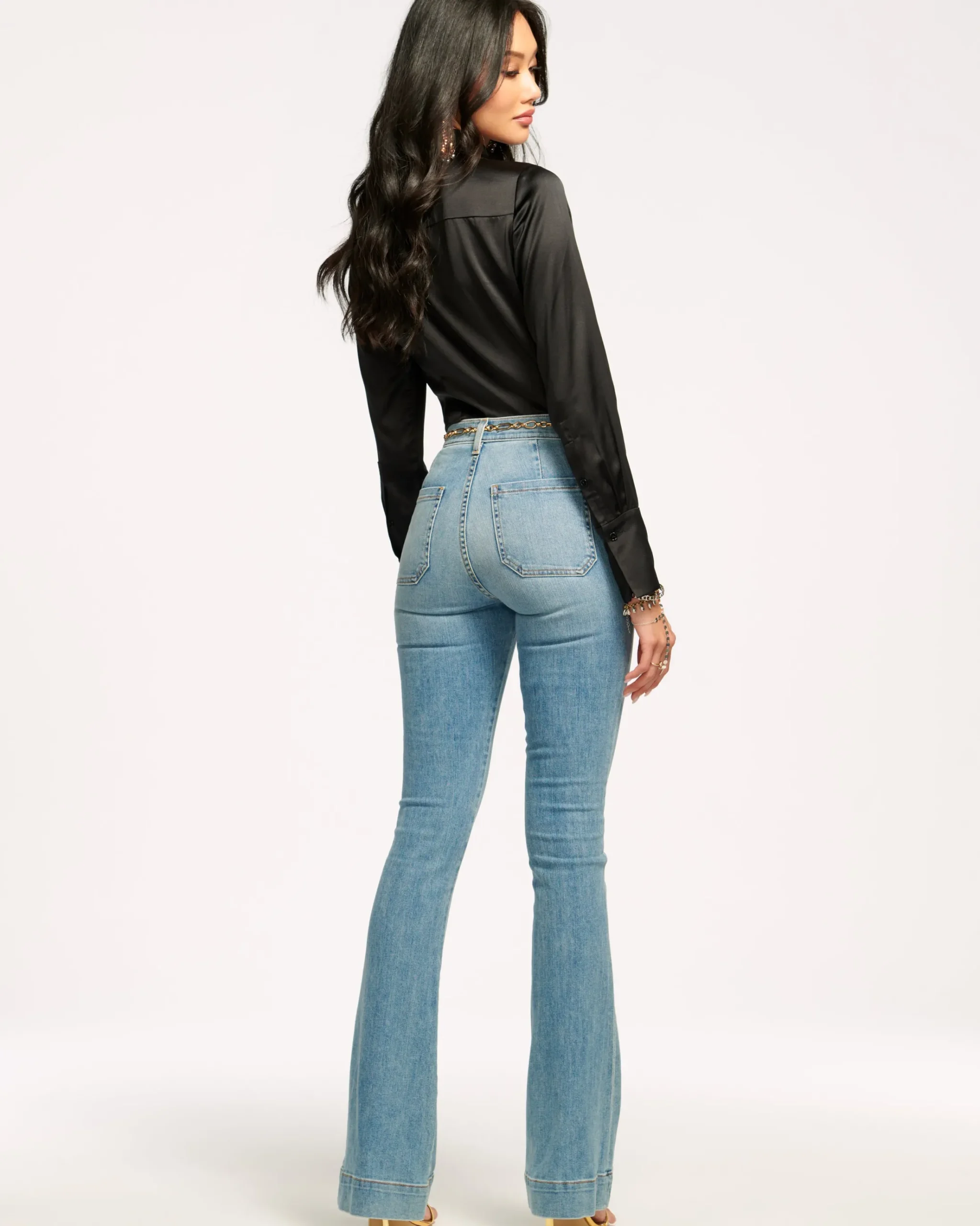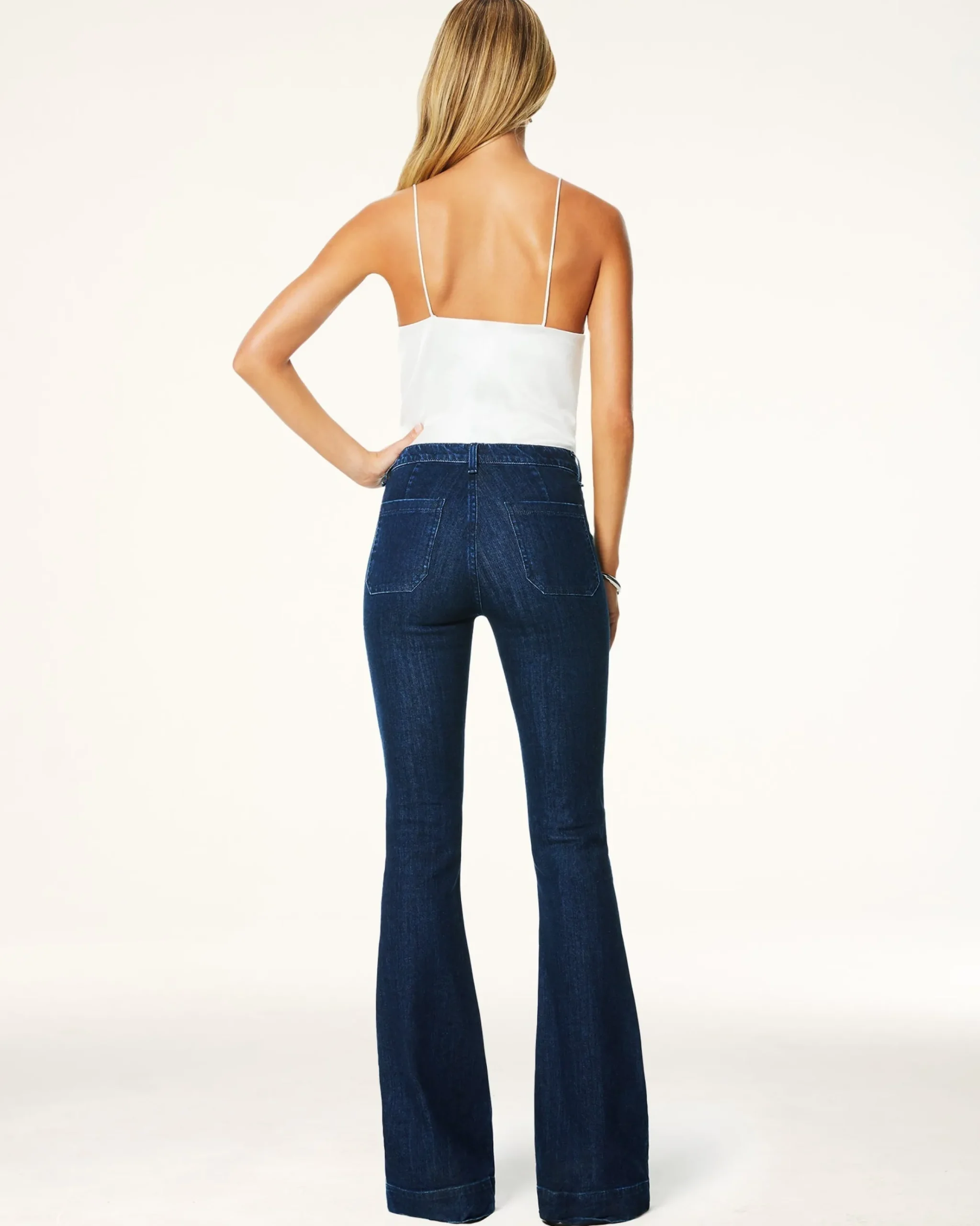 Our Cindy High-Rise Flare serves up serious retro vibes with the same sculpting, flare silhouette as our best selling Helena. The five-button closure and square front pockets will elevate your ensemble whether you’re headed to a casual brunch or a hot date. Crafted from Japanese denim with just the right amount of stretch, these jeans will satisfy your 70s disco fix.