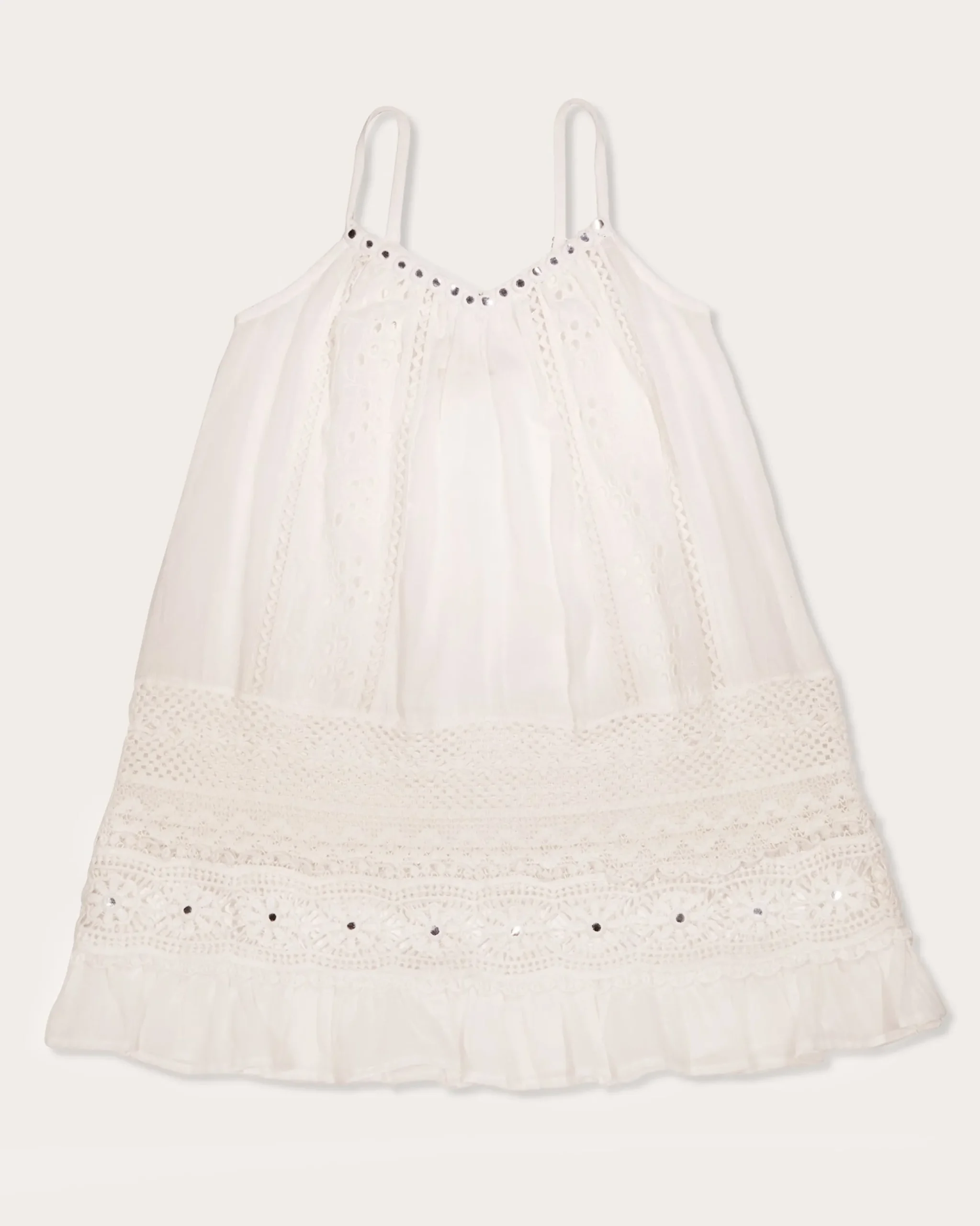 The Layla is a versatile coverup mini dress featuring sweet embroidery and mirrored details. Pair this coverup dress with a swimsuit in any pop of color, and your mini will look fabulous from the pool deck to beachside brunch.