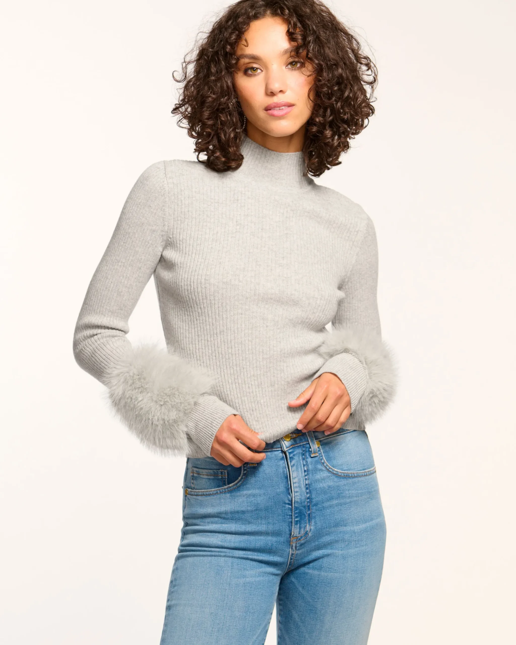 Master apres ski dressing in the Magnus, a luxurious fitted, ribbed knit Merino turtleneck sweater best paired with mulled wine at the chalet. Cozy and warm, this polished design gets a contemporary spin with the faux fur sleeve details.