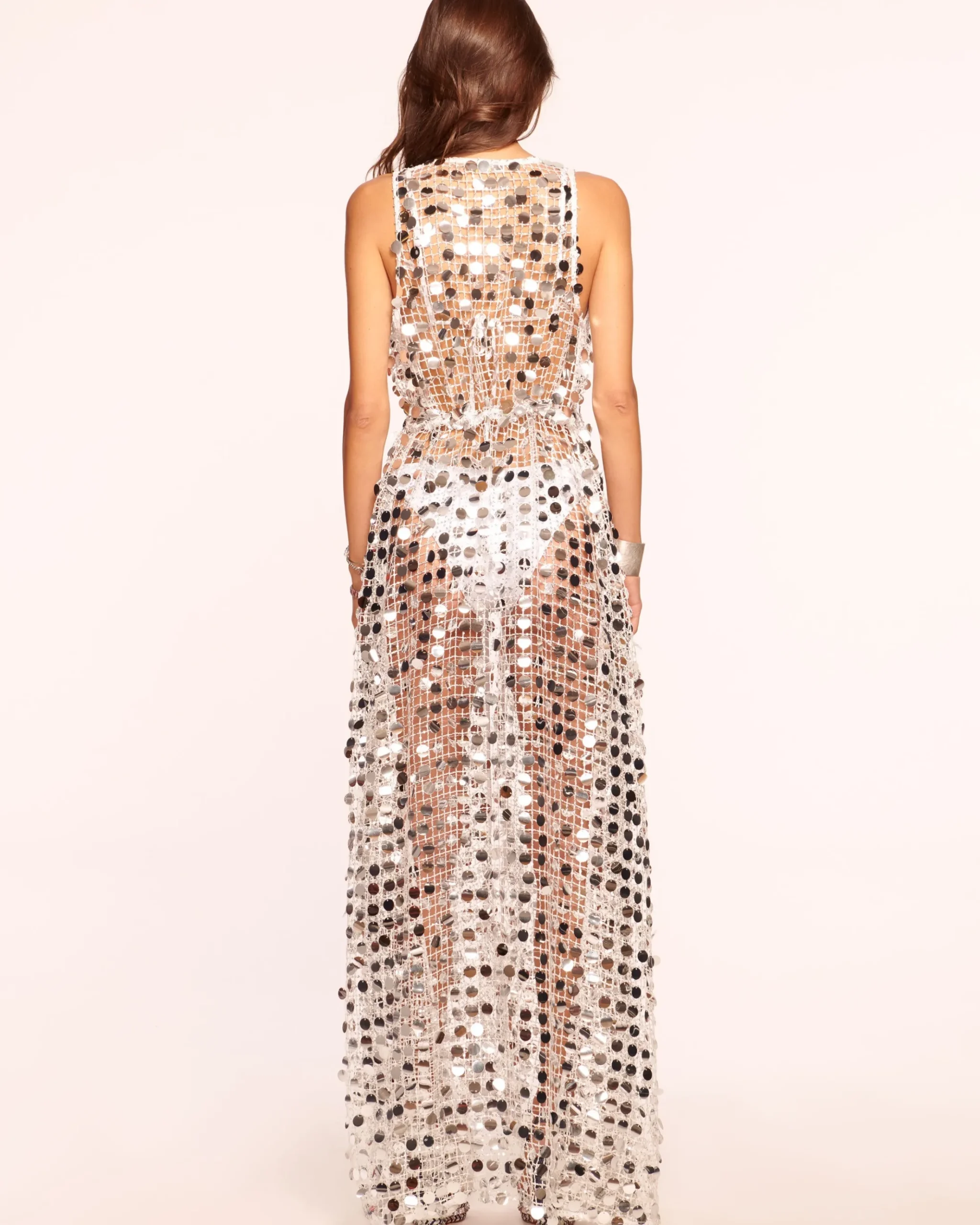Shimmer beneath the island sun in the Michaela, a destination design made for a spin around the beach club. Dramatically adorned with paillette mesh for an eye-catching delivery, tie this sheer style at the waist and prepare to steal the show.