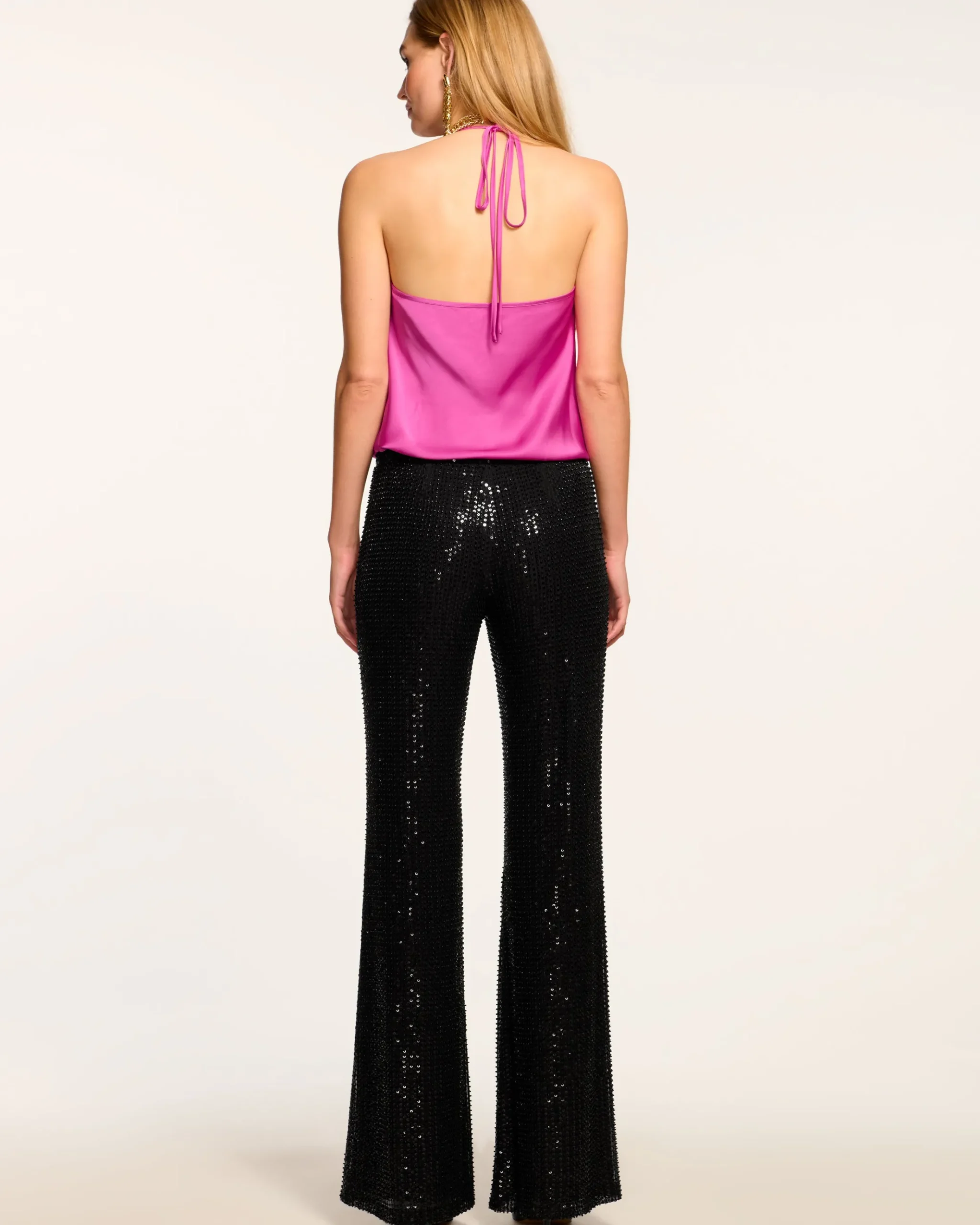 Meet the Olivian: the perfect party pant. This seventies-inspired flare pant is crafted from an allover sequin beaded mesh fabrication and made for nights on the dance floor. Style with the matching Sullivan halter top for a high impact look, or switch it up and style with a silky pop of color halter top or dress it down with a sweater.