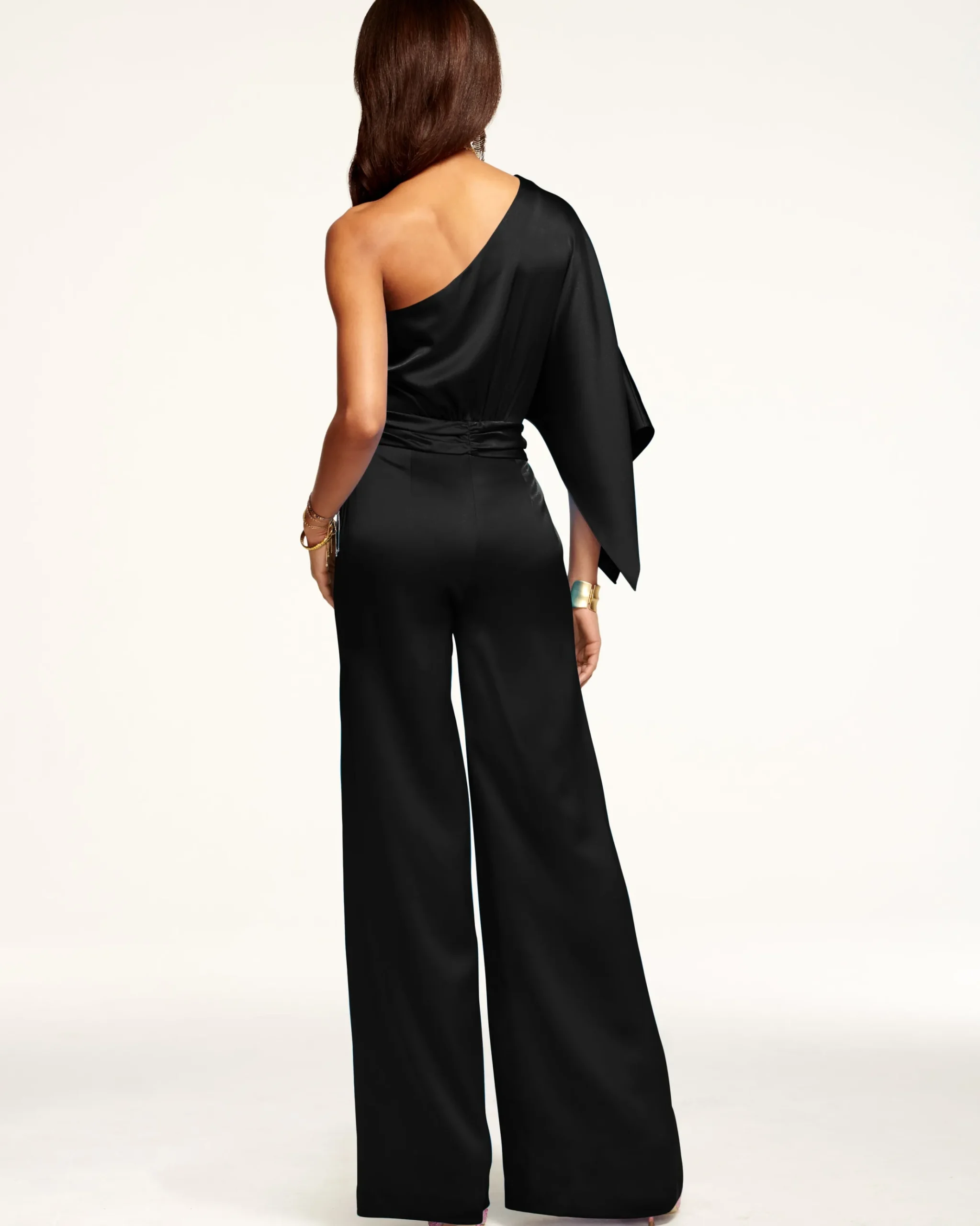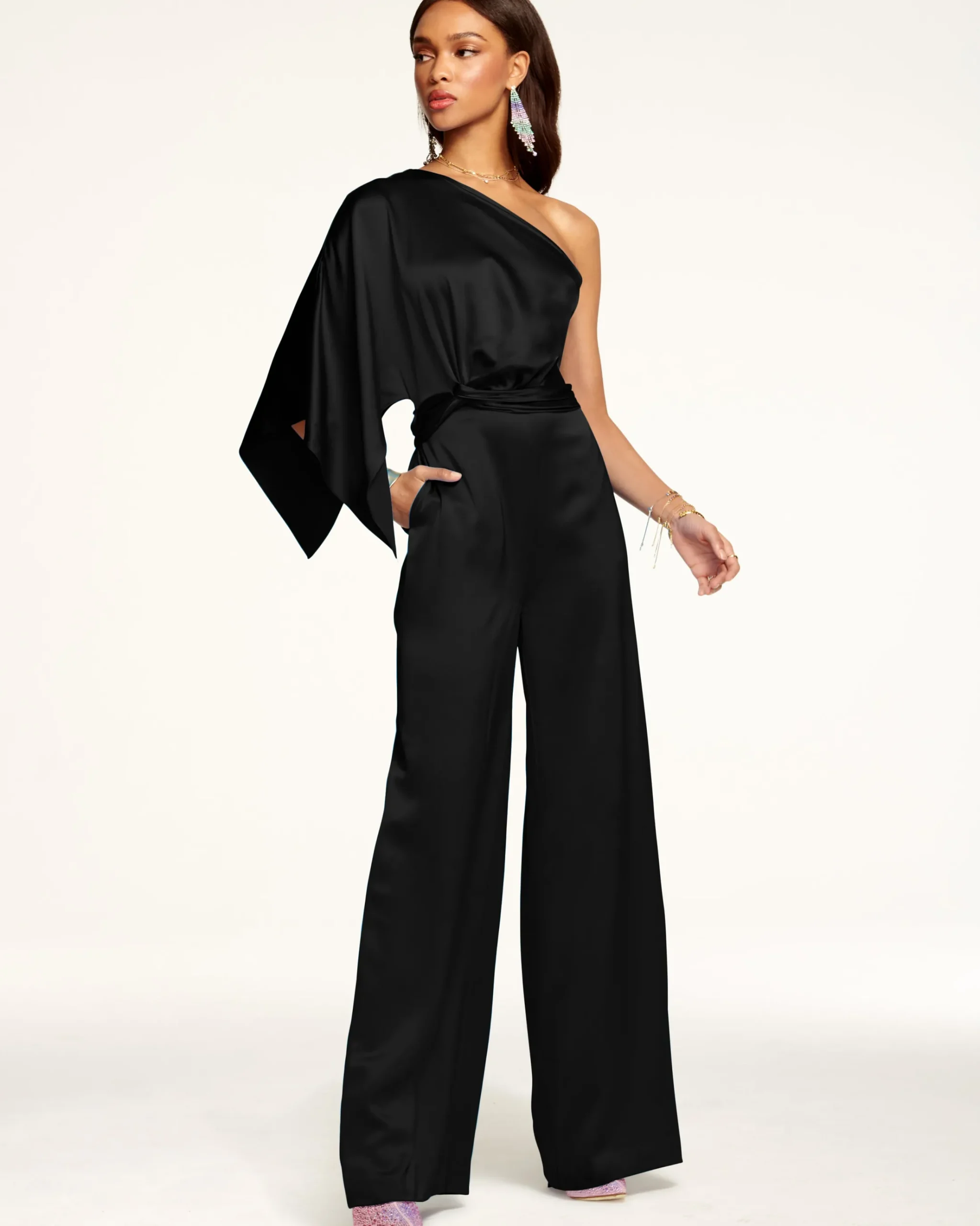 Feel bold and look beautiful in the Simone, a statement jumpsuit fashioned in rich jewel tones. Get the best of both worlds with the one shoulder bodice, expertly fashioned with one dramatic sleeve. Cinched at the waist with an alluring twist, this sweeping design will have you standing tall.