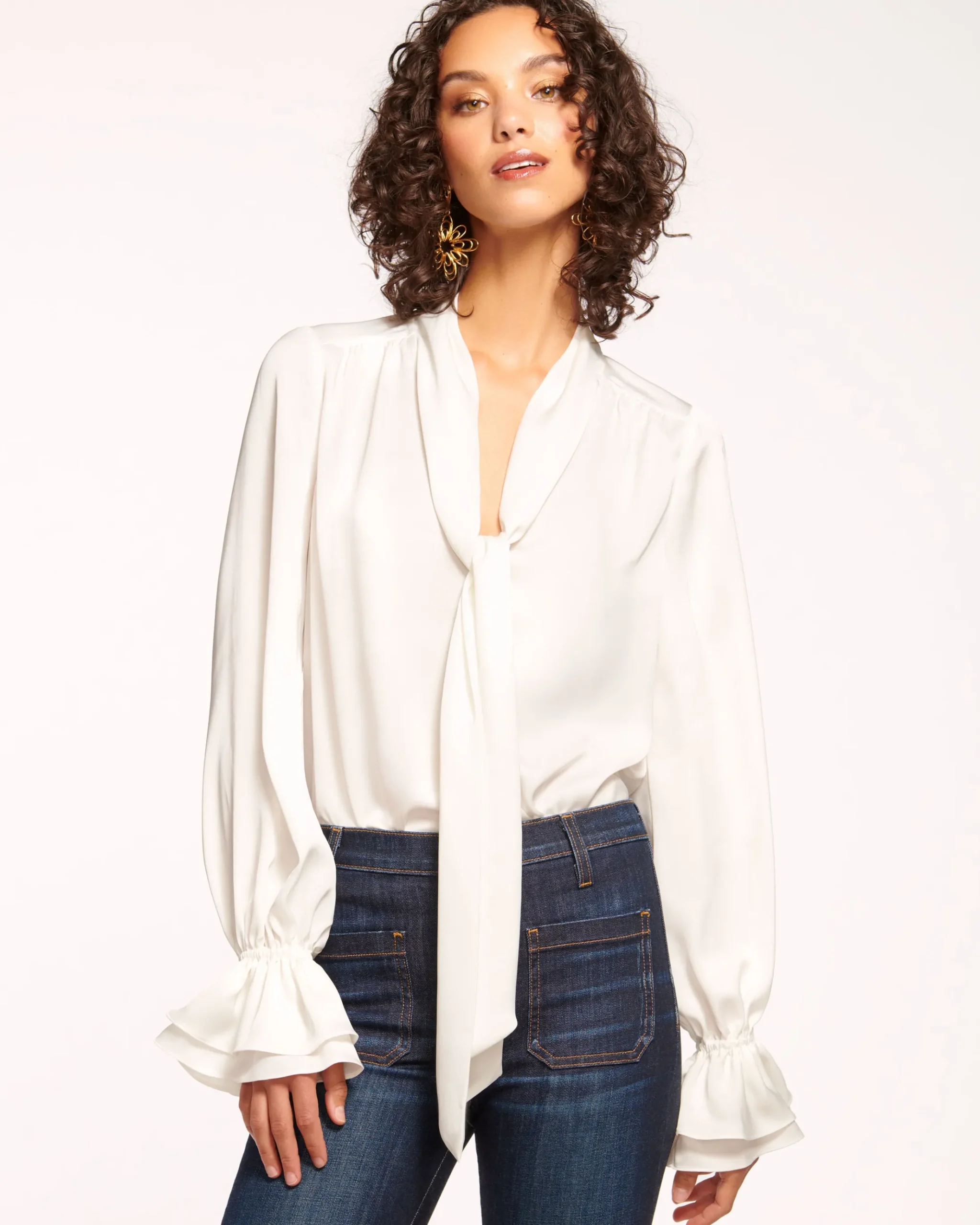 Elegant and versatile, the Tammy tie front blouse is the perfect addition to your wear-to-work wardrobe. The tie at the v-neckline and double ruffle-adorned cuffs add a feminine touch. Style with high-waisted denim for a polished fall look.