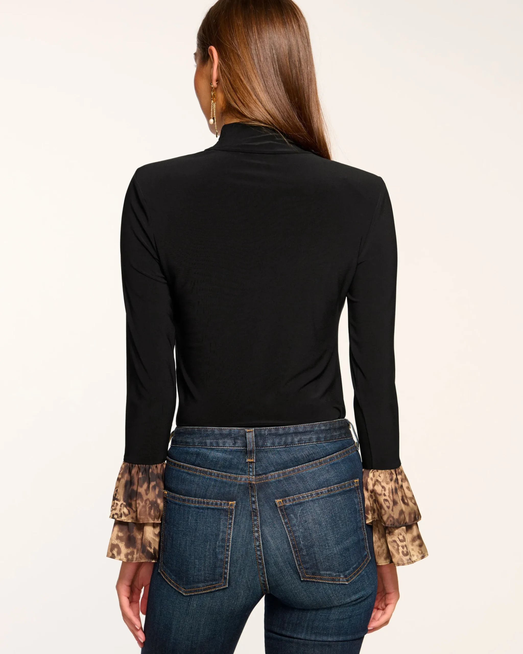Turtleneck gets a twist in the Vickiana. This fitted silhouette with contrast ruffle sleeves proves that practical can be pretty too. A double flounce detail and stretch fabric create unexpected drama. Your workwear just got more interesting.