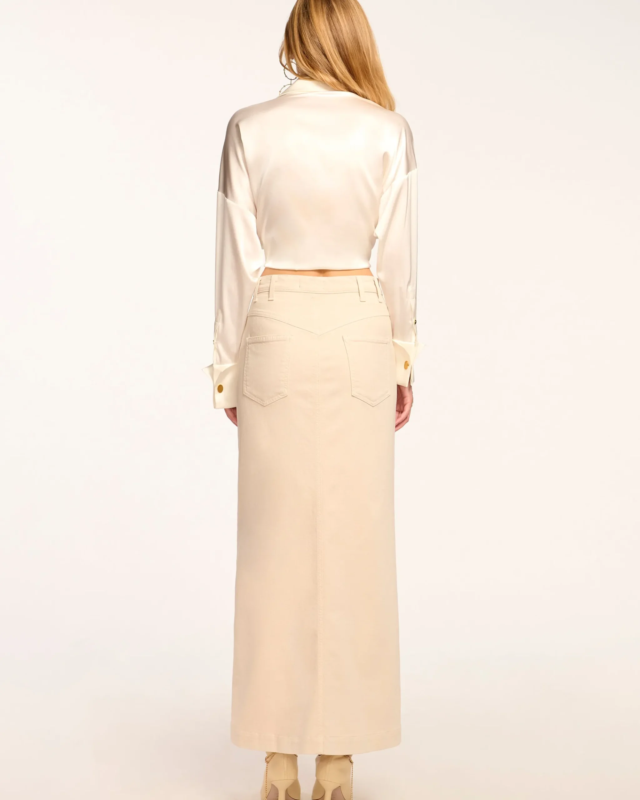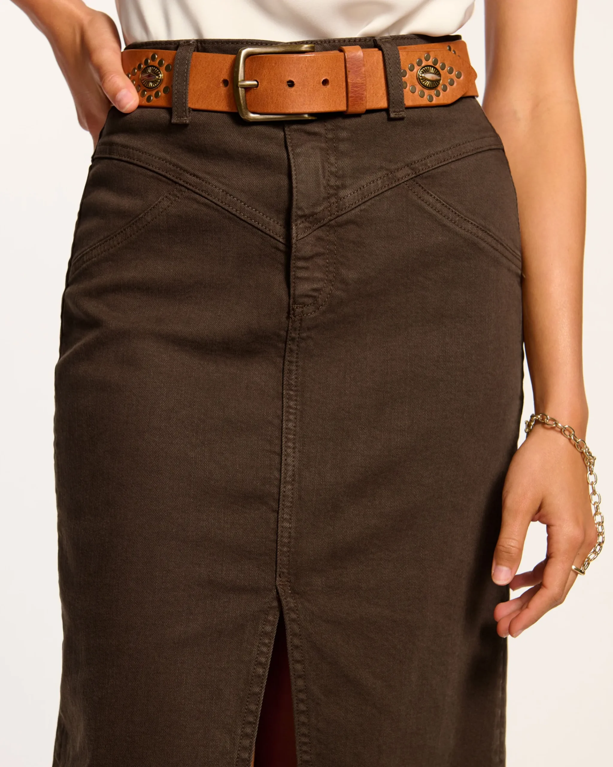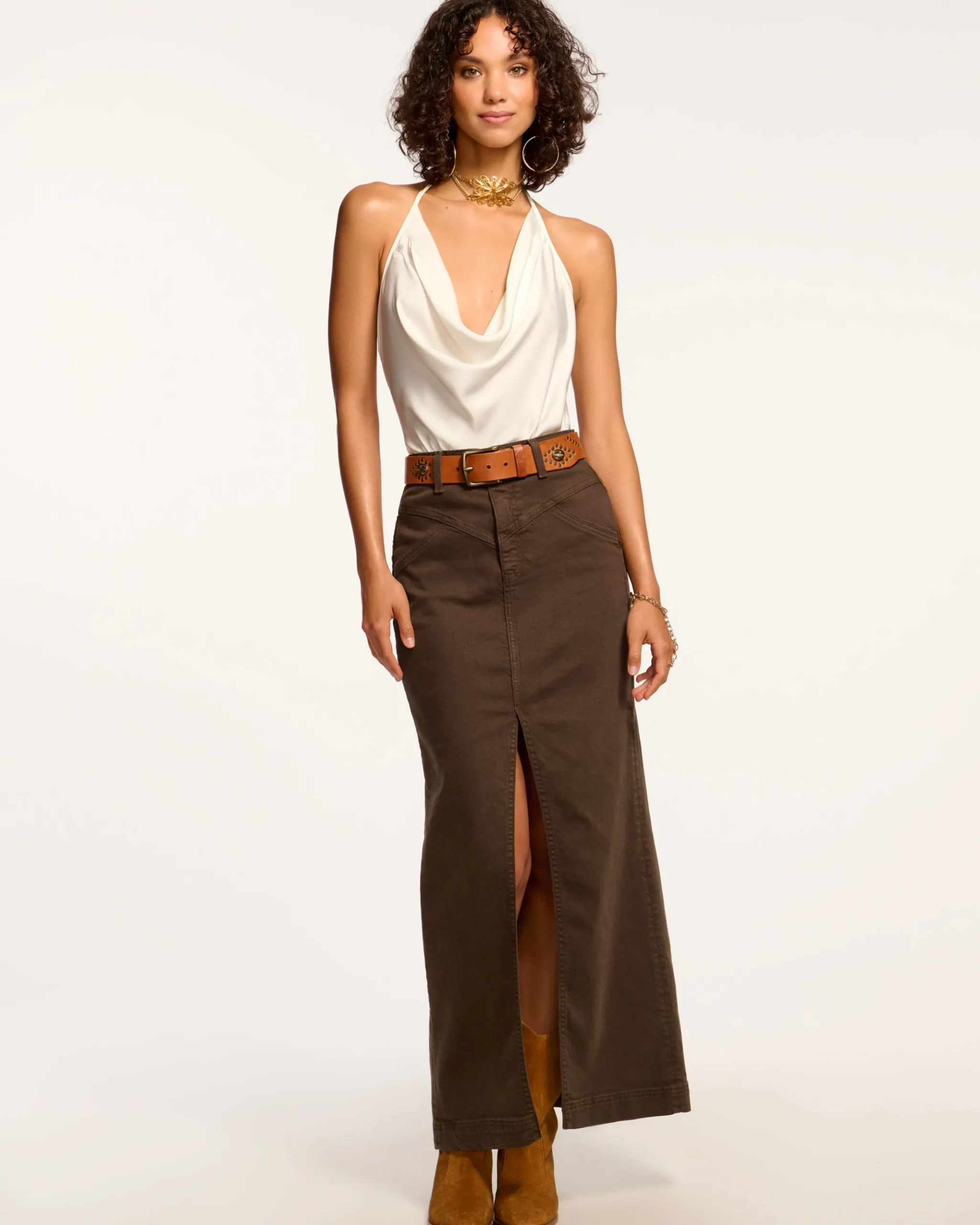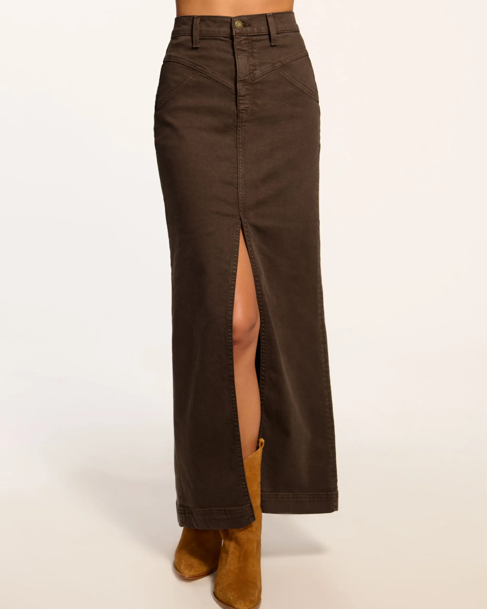 Bring western glam to the everyday with the Xavier, a washed denim maxi skirt with a high-rise fit and yoke detail. The center-front slit will show off your favorite pair of boots. Style this denim jean skirt with a sweater or a crop top.